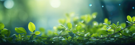 Scenic sunny natural green background. Lens flare on beautiful leaves. Amazing morning landscape of nature with sunbeams. Rich greenery in sunny day with copy space. Scenery of vegetation in sunlight.