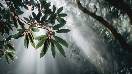 A tranquil forest scene features misty light streaming through lush green leaves and towering evergreen trees, creating a serene natural atmosphere perfect for relaxation.
