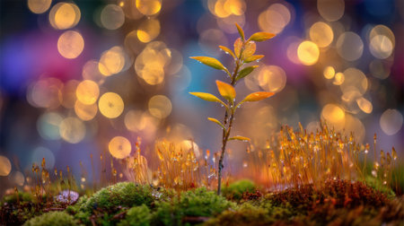 A solitary green leaf thrives amidst vibrant moss, illuminated by captivating bokeh lights, creating an enchanting and serene atmosphere in nature photography.