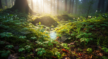 Soft sunlight illuminates a mossy forest floor with tiny green sprouts reaching upwards. The background is a blur of green foliage and bokeh lights.