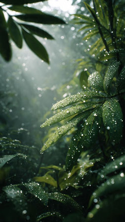 Bright rays of sunlight pierce through the lush greenery of a rainforest, illuminating the misty air and revealing diverse plant life in the serene morning atmosphere.