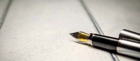 Black pen on a white notebook paper, accessory for creativity on the table