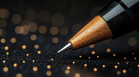 Close-up of Elegant Gold and Black Pen Tip on Sparkling Dark Bokeh Background