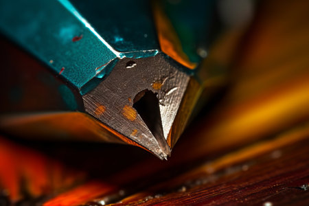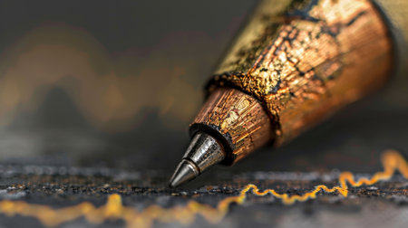 Close up view of metallic pen resting textured surface, showcasing intricate details and vibrant color contrast. pen tip is poised above line graph, symbolizing creativity and precision writing
