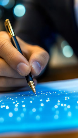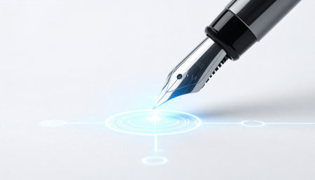 A classic fountain pen's nib touches a clean white surface, emitting a glowing blue digital interface.