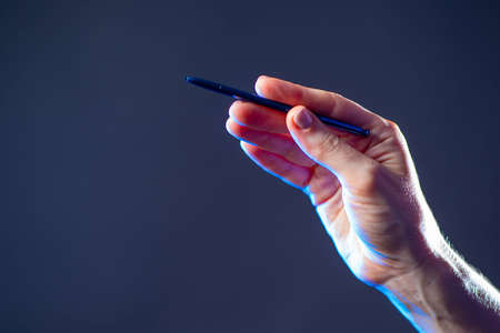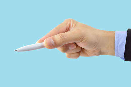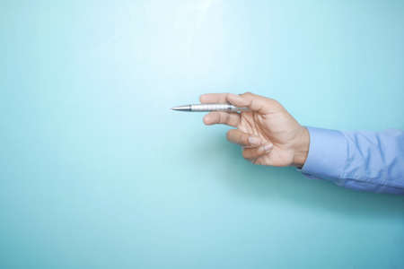 male hand holding a pen blue background