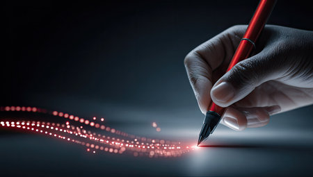 Close up of human hand writing with red pen on dark background with red glowing lines