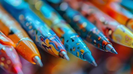 Row of Colorful Pens on a Blue Background