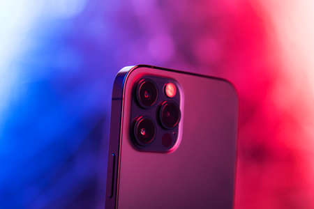 Macro advertising, exterior design. Apple new smartphone with triple-lens camera - Ultra Wide, Wide and Telephoto
