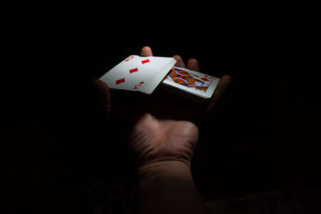 hand hold a deck of cards one hand shuffle volt poker on a black background copy space. close up