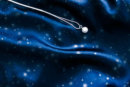 Jewellery brand, Christmas shopping and Valentines day gift concept - Luxury white gold pearl necklace on dark blue silk, holiday winter magic jewelery present