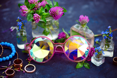 Stylish pink kaleidoscopic sunglasses with golden bracelets and rings in a feminine style concept with clover flowers on a dark background. Beautiful summer accessories.