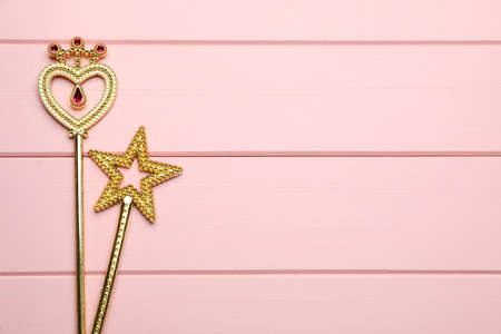 Different golden magic wands on pink wooden table, flat lay. Space for text
