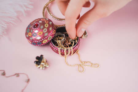 Woman takes jewelry from a small box on a pink background. High quality photo