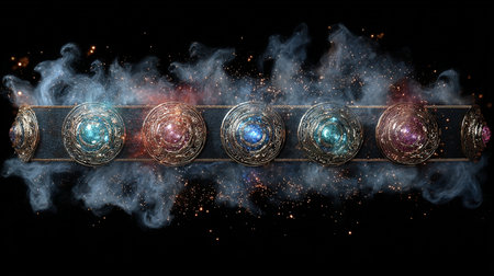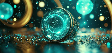 high quality illustration, an amulet embellished with shimmering gemstones reflects a colorful rainbow, creating a magical concept background with space for text