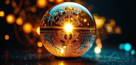Crystal orb with swirling patterns sits on detailed magical symbols, reflecting light in a dark environment, creating an atmosphere of mysticism and esoteric wonder