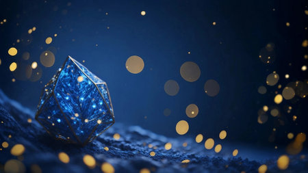 A captivating glowing geometric shape rests on a textured table, illuminated by warm candlelight in the background, creating a modern and artistic ambiance.