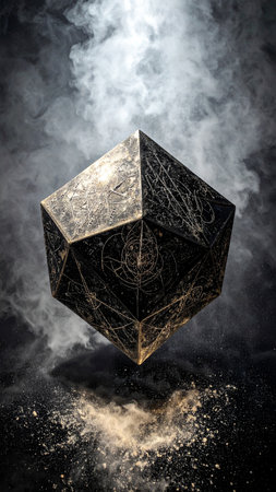 Realistic floating metallic cube engraved with alchemical icons, suspended in a glowing sacred geometry grid, soft background gradient, no people, no text, subtle light beams for depth, copy space composition