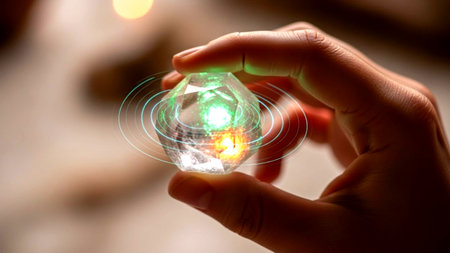 A person holds a holographic crystal that emits green and orange glowing effects, creating a futuristic and mystical appearance.