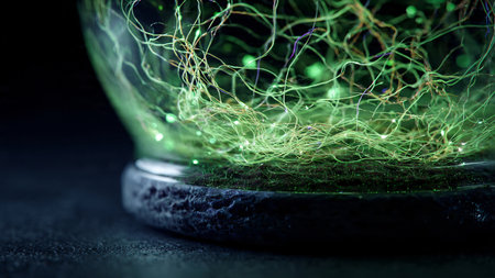 Crystal ball with green moss inside on dark background. 3D rendering