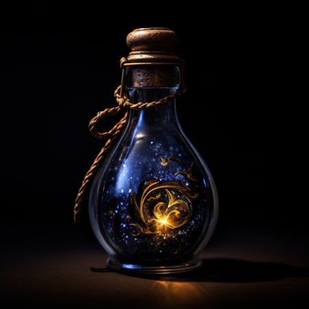 A glass bottle with a rope around it and a glowing light inside. The bottle is filled with a blue liquid and has a dragon design on it. The bottle is placed on a dark surface, creating a mysterious