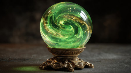 A captivating green crystal globe shows a swirling pattern of cosmic stars against a dark background.