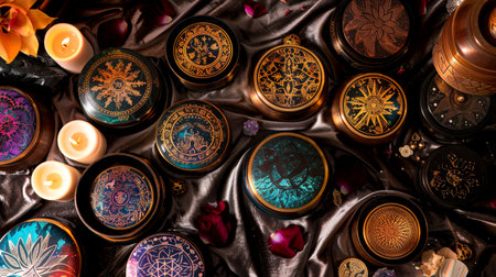 A lavish assortment of Tibetan singing bowls is arranged beautifully alongside glowing candles and scattered rose petals, creating a serene atmosphere.
