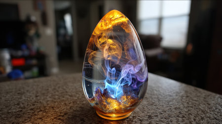 This stunning glass sculpture showcases a mesmerizing blend of colors swirling within a translucent form, radiating a bewitching glow.