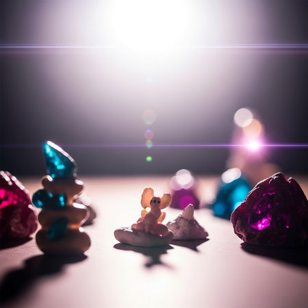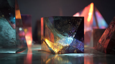 Geometric shapes and crystals subtly glowing under a darklight, casting complex, colorful reflections and shadows.