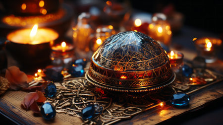 Antique tableware illuminated by the enchanting glow of burning candles in a mystical setting