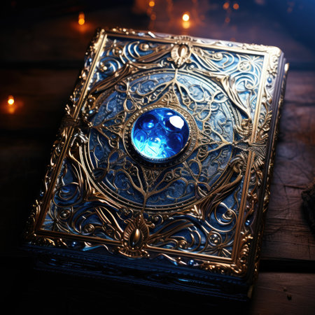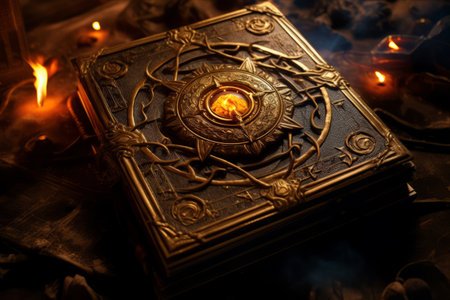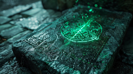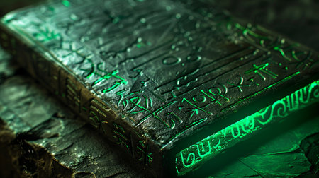 This image features an ancient book with intricate symbolic engravings, illuminated by a mysterious green light. The textured surface evokes a sense of mystique and magic, ideal for themes of lore and ancient artifacts.
