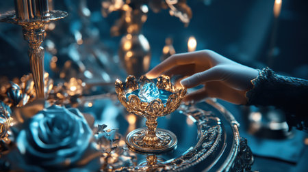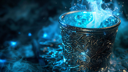 A stunning mystical cup surrounded by enchanting blue smoke, creating a captivating fantasy atmosphere. Perfect for creative and magical aesthetics.
