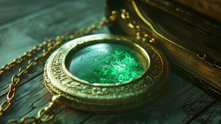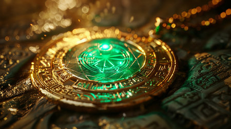 An enchanting golden pendant with a glowing green symbol rests on an ornate ancient surface, showcasing intricate details and a magical ambiance.