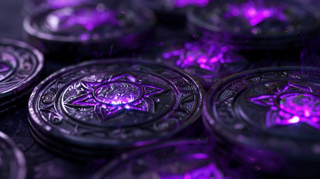 Discover a captivating collection of purple symbol coins set against a dark background, perfect for enhancing any mystical or fantasy-themed project.