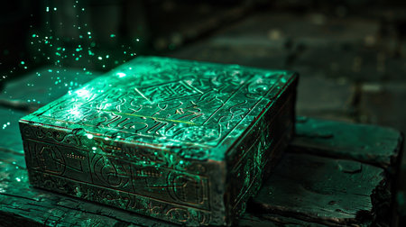 Explore a mystical box adorned with intricate symbols and glowing green lights, creating a captivating scene full of mystery and ancient allure.
