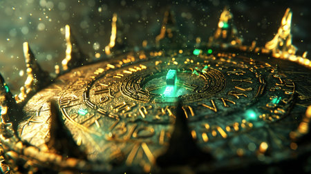 Intricate golden symbol adorned with emerald accents creates a mystical atmosphere. Perfect for fantasy themes and artistic projects, this image conveys ancient allure.