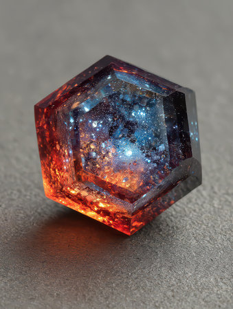 Captivating hexagonal crystal showcases vibrant colors and sparkling details. Its unique formation and shimmering surface create a mesmerizing visual experience.