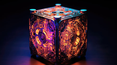 A closeup shot of a crystal cube with neon lights on a dark background