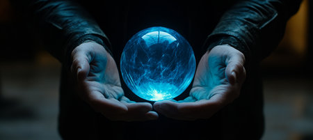Experience the magic and mystery of a glowing crystal ball held carefully in hands, showcasing a swirling universe of light and cosmic energy.
