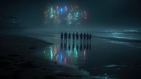 Several people are standing in silhouette on a dark, wet beach at night, facing a body of water where colorful, glowing lights resembling fireworks or an otherworldly display are visible in the foggy sky above. The bright colors of the illumination are reflected vividly on the slick, dark sand near the water's edge, while a structure sits dimly in the background to the left.