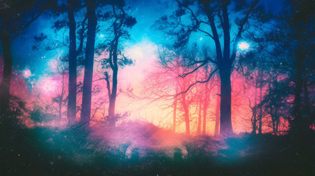 A magical forest scene illuminated by vibrant pink and blue hues at twilight.