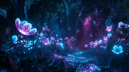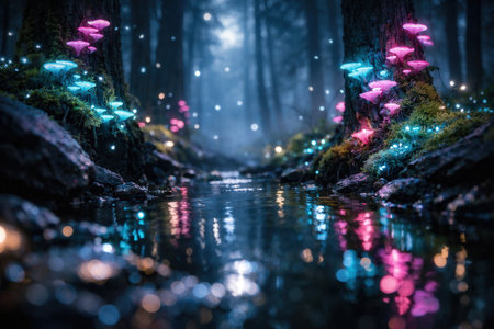 Bioluminescent Magic Forest With Glowing Mushrooms And Stream