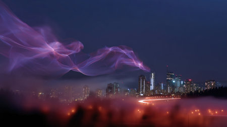 A nighttime cityscape illuminated by streetlights with distorted air plumes shifting in hues of purple and red visually representing the hidden dangers of airborne toxins