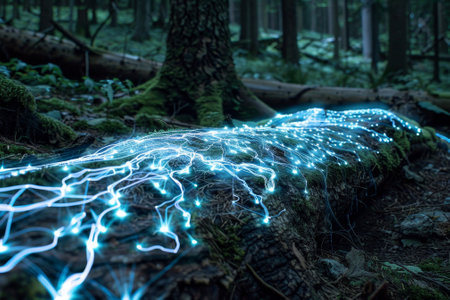 A tree trunk is lit up with blue lights. The lights are arranged in a way that they look like they are flowing down the tree. The image has a dreamy, ethereal quality to it