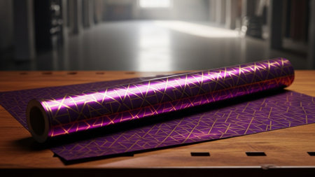 A cinematic wide shot (16:9) capturing a roll of metallic purple and gold geometric wrapping paper p
