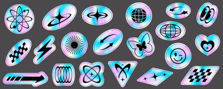 Y2k holographic stickers set. Retro gradient foil shapes and futuristic labels. 2000s rave neon collection. Textured graphic space badges. Vector.