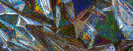 Round holographic duct foil sticker surface with wrinkles and colorful iridescent on background shimmer transparent