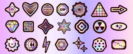 Y2K holographic sticker pack with geometric shapes, crystals, flowers - vibrant iridescent gradients background. Retro 90s aesthetic icons. Fun sparkly decals for nostalgic vintage 2000s design.