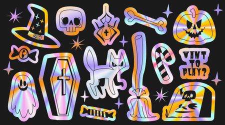 Halloween holographic stickers with gradient colors - spooky ghost, skull and spider, tombstone with RIP text, cauldron and witch cat on black background. Mystical elements with iridescent effect.