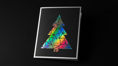 A modern Christmas tree is featured on a black greeting card. The tree is composed of geometric, polygonal shapes with sharp edges, creating an abstract and fragmented appearance. Each segment reflects holographic light, displaying a vibrant spectrum of iridescent colors. The card itself has a silver border and is set against a dark, plain background, emphasizing the striking visual of the tree. This offers a contemporary and artistic take on a traditional holiday symbol.